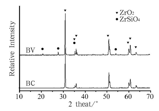 可見(jiàn)采用釩鋯藍(lán)色料制備的ZrO2 陶瓷(BV) 其主晶相為四方相ZrO2,還有很少量的硅酸鋯相。說(shuō)明高溫?zé)Y(jié)沒(méi)有使硅酸鋯分解,陶瓷的呈色是由色料導(dǎo)致。而采用Co3O4制備的藍(lán)色ZrO2陶瓷(BC) 中只有四方相ZrO2,沒(méi)有其他雜相。陶瓷的呈色可能是由于Co 溶入ZrO2 晶格中導(dǎo)致。